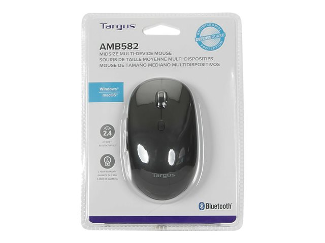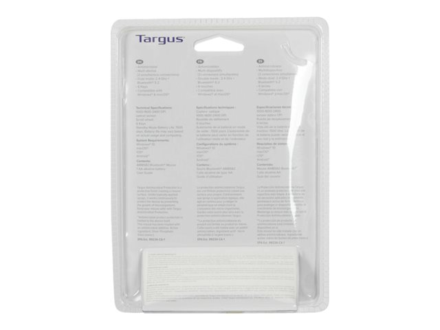 Description du produit Targus Confort multi-appareils de taille moyenne - souris - antimicrobien - Bluetooth, 2.4 GHz Type de périphérique Souris Technologie de connectivité Sans fil - Bluetooth, 2.4 GHz Résolution 2400 dpi Performances Commutation de sensibilité en temps réel 800/1 200/1 600/2 400 ppp Caractéristiques Protection antimicrobienne Batterie Type AA Système d'exploitation requis Apple MacOS, Microsoft Windows