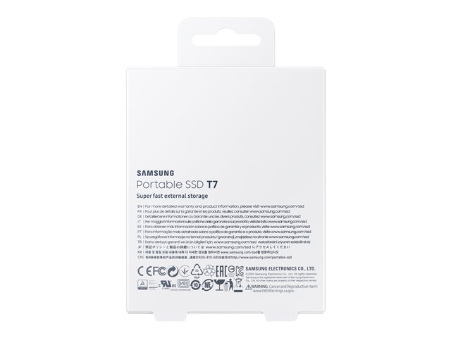 Description du produit Samsung T7 MU-PC2T0H - SSD - 2 To - USB 3.2 Gen 2 Type Lecteur à semi-conducteurs - externe (portable) Capacité 2 To Cryptage matériel Oui Algorithme de chiffrement AES 256 bits Interface USB 3.2 Gen 2 - USB-C Débit de transfert de données 10,0 Gbps (USB 3.2 de 2e génération) Caractéristiques Antichoc, authentification du mot de passe, Dynamic Thermal Guard protection, NVM Express (NVMe), AES 256 bits Source d'alimentation Bus USB Couleur du boîtier Bleu indigo Dimensions (LxPxH) 85 mm x 8 mm x 57 mm Poids 58 g Garantie du fabricant Garantie de 3 ans